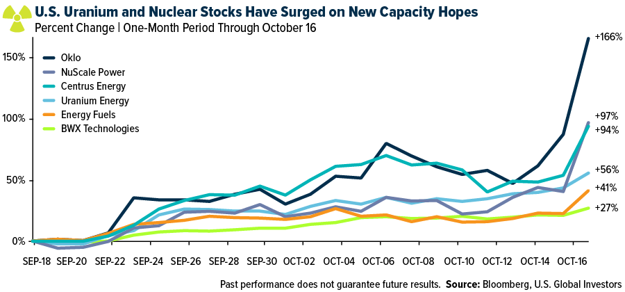 Since Microsoft’s nuclear deal with Constellation was announced, stocks in companies like Oklo have skyrocketed. Oklo, which is backed by OpenAI CEO Sam Altman, has surged more than 166% in the month through mid-October. Other nuclear stocks, including NuScale and Centrus Energy, have also seen impressive gains. For investors looking for exposure to the energy sources that will power the AI age, nuclear might just be the next big thing.
