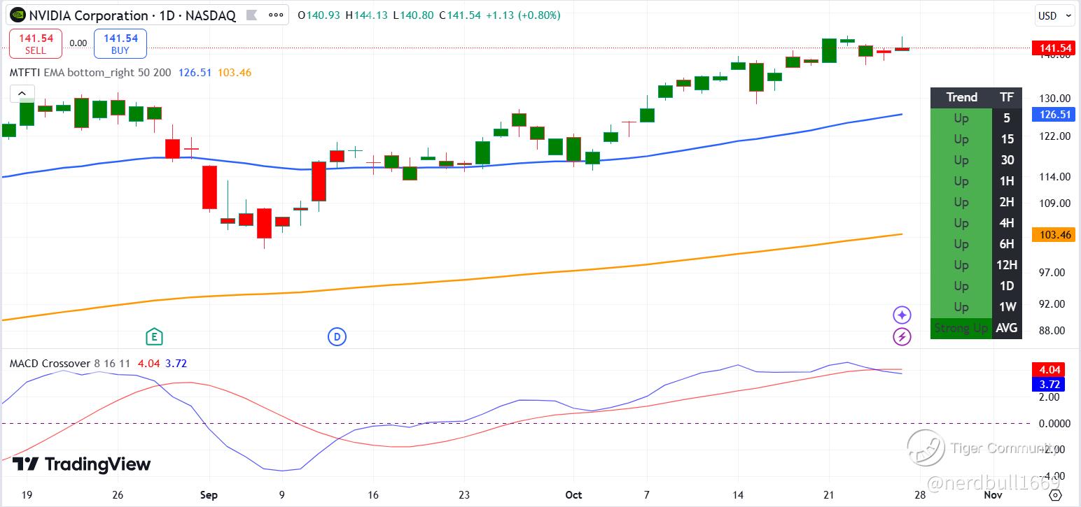 We are seeing significant improvement in the stock price movement though it start to form a sideway trading, but for the long term, we should be seeing a nice upside on NVDA, with possibility of hitting $180, as it is trading comfortably above the short-term and long-term MA, and MTF is also showing a strong uptrend.