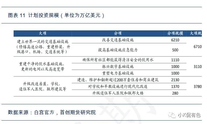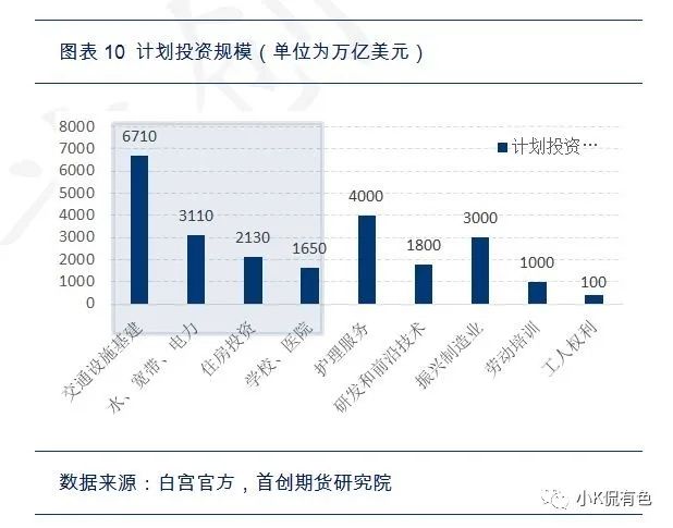 5、3月31日公佈的計劃只是拜登總統經濟復甦計劃的第一部分,着重解決道路橋樑重建、鄉村地區網絡寬帶拓寬等基礎建設改革問題。而將於四月份公佈的第二份法案,將涉及兒童保育措施、醫療保健補貼等問題。在這次公佈的第一部分中,投資被分爲四大部分,分別是1.振興製造業2.更新美國交通運輸系統3.提供乾淨飲用水及更新的電網和高速寬帶4.解決住房問題,翻新學校、醫院。其中交通設施、飲水電網寬帶、住房、學校、醫院均屬於基建投資。通過拜登方案的細則,在未來的八年**將累計支出2.3萬億美元,這其中與基建相關的幾項合計規模1.57億美元,每年約佔到GDP的0.89%。