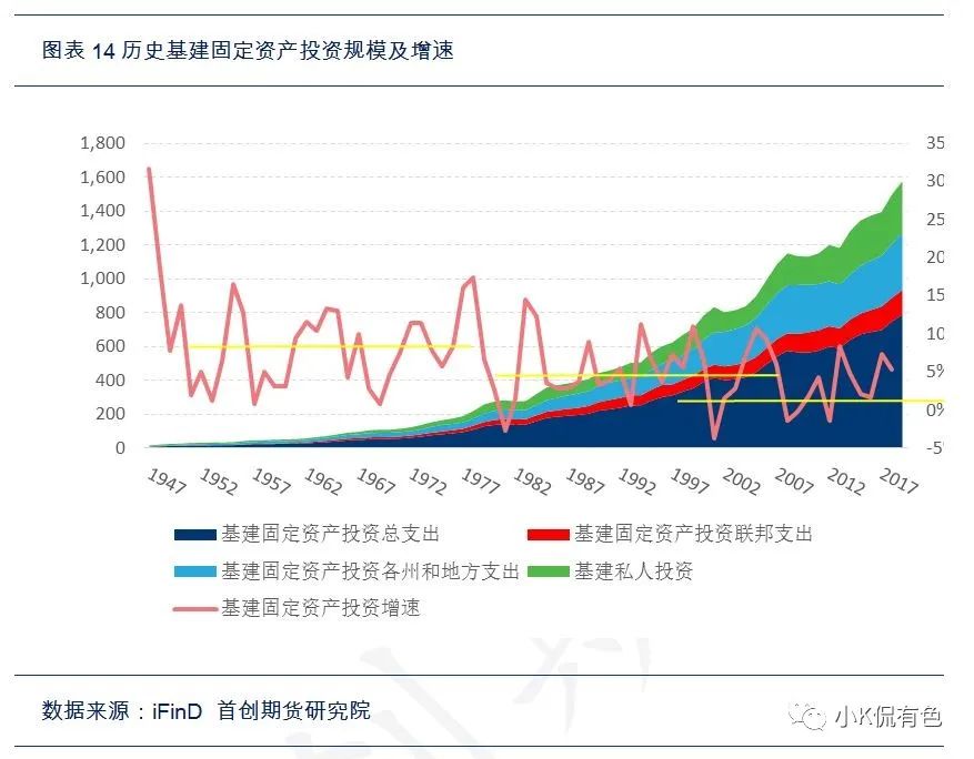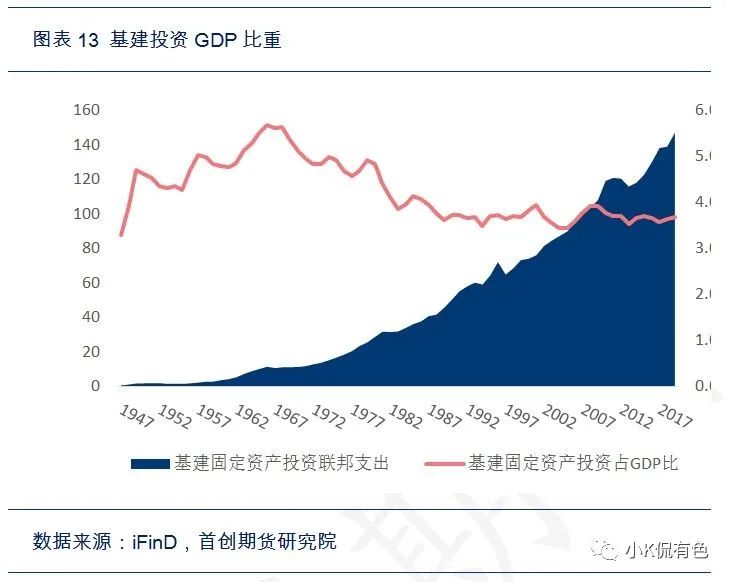 從歷史上來看美國基建與固定資產增速同步,佔比基本在20%上下波動,近些年穩定在18%附近。歷史上只有一段時間兩者的走勢是相背離的,這段時間與二戰重合,主要原因是由於二戰的爆發,國防支出大幅增加,基建由於二戰而暫停支出,導致兩者大幅背離。