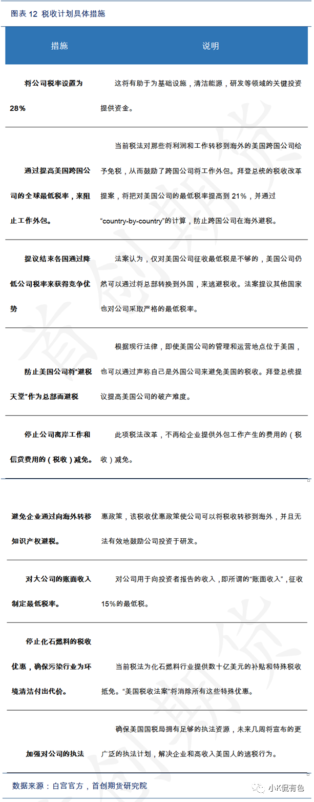 爲了籌措就業計劃的資金,白宮同時還發布了稅收計劃。主要內容是提高稅收籌措資金和提高跨國公司最低稅率使工作機會重返美國。具體包括: