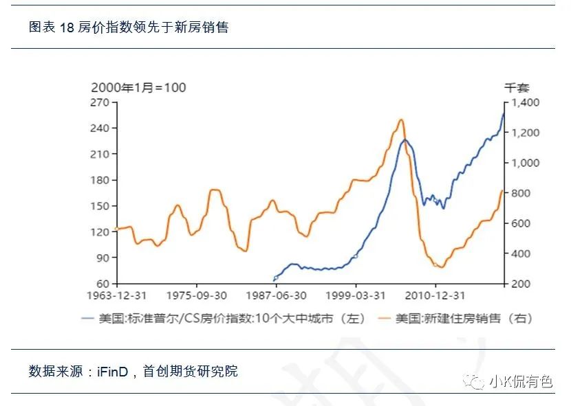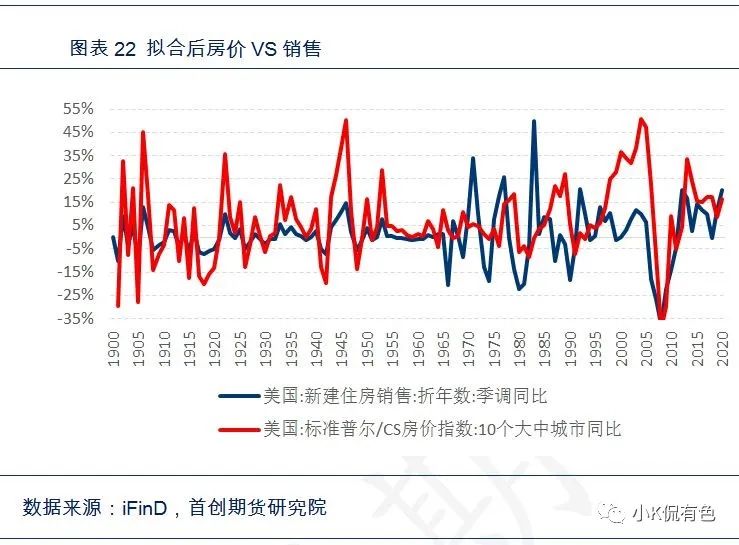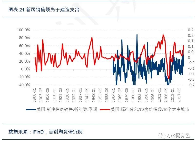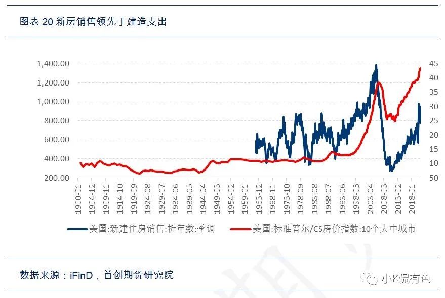 如果要做大宗商品歷史對比,我們離不開對房地產的討論,因爲畢竟基建只是消費其中的一部分。但是在討論房地產的問題時,遇到了遠比基建要複雜的事情。因爲房地產的歷史數據太短了,我們只能間接推算,大概估算出了規模。美國的房地產價格數據起始於60年代,銷售數據起始80年代,支出數據起始於90年代。那麼我們怎麼解決30年代的房地產規模數據呢?我們利用了耶魯大學經濟學家Shiller的追蹤價格數據,追溯到1890年。然後根據價格領先於新房銷售,新房銷售領先於建造支出的邏輯,可以通過數據擬合推算出30年代的房地產的大致規模數據,從而大致算出大宗商品的消費量。