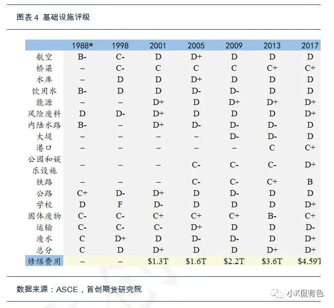 3、美國的大部分基礎設施建於上世紀30-60年代,目前大量設施老化嚴重。根據美國土木工程協會2017年發佈的基礎設施報告,美國的基礎設施整體評級爲D+,其中航空業、飲用水、公路和公共交通均處於極度不佳狀態。根據ASCE 評估,2020~2029 年,美國基礎設施建設投資面臨 2.59 萬億美元資金缺口。