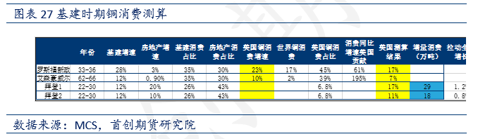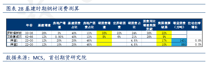 根據上述假設,我們模擬推算出平均每年消費增加29/18萬噸銅,同比增加17%/11%,帶動全球消費增加1.2%/0.8%;同樣地,模擬推算出平均每年消費增加1431/860萬噸鋼材,同比增加17%/10%,帶動全球消費增加0.8%/0.5%。