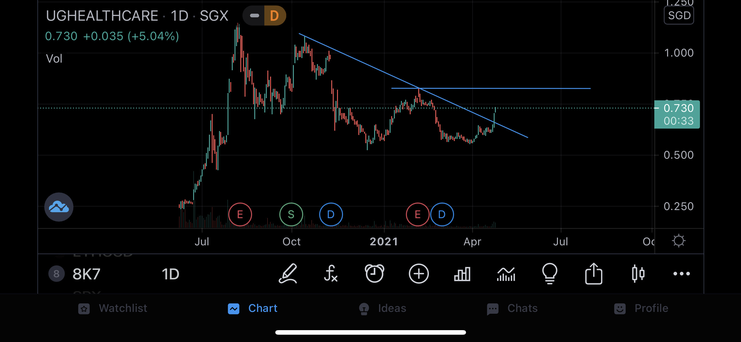 $UG HEALTHCARE CORPORATION LTD(8K7.SI)$UG will be releasing Q321 results on 10th May. If UG can break above $0.825, then may have the chance to test $1.00 to formthe W pattern from double bottom. Good luck all.