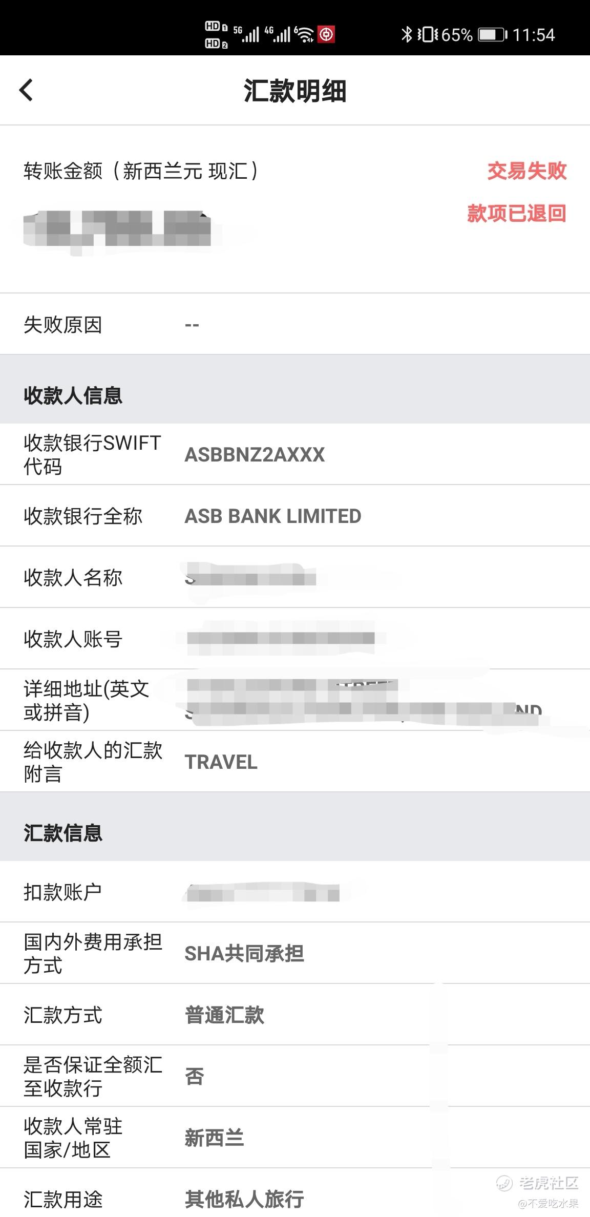 成功入金讓我對接下來的轉賬充滿了信心,因爲我是週五成功入的第一筆金,馬上就週末了,跨境匯款要工作日,就在這週一開始操作。在實際操作前發現中國銀行匯新西蘭賬戶不支持使用-,而新西蘭賬戶裏面有-這個符號,爲此還專門諮詢了asb銀行的客服,他們向我提供了建議,可以用空格代替,但是我在實際操作中還是失敗了。由於並不能使用空格,我用/代替,週一提交,週二銀行打來電話賬號格式不對,匯款失敗打回款項。銀行讓我去掉斜槓全數字提交,週二重新提交之後速度很快,當天就給我匯出,第二天早上7點就到了我的asb賬戶。