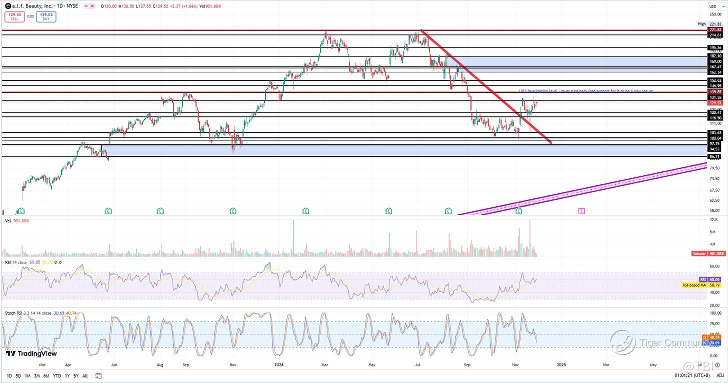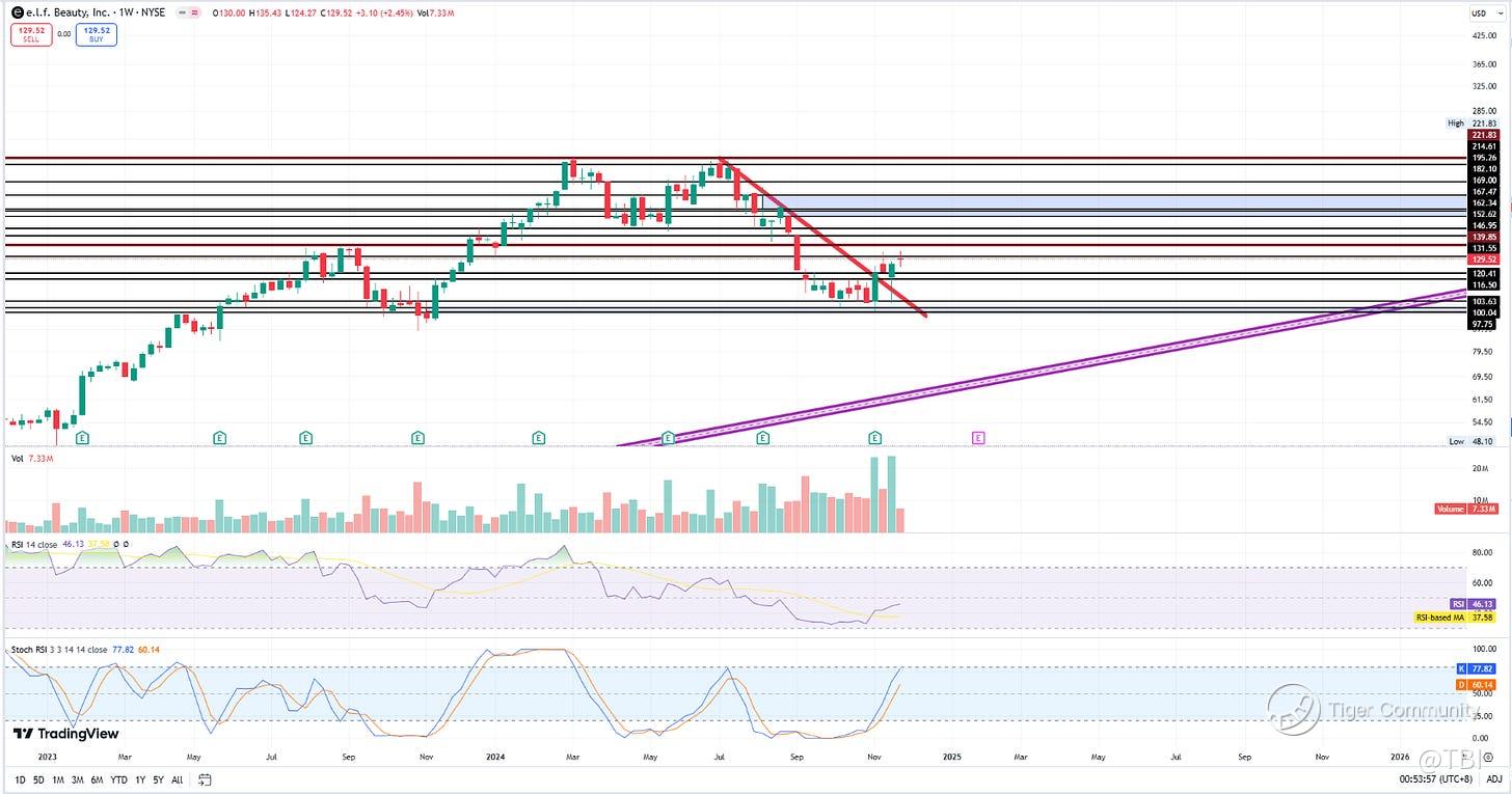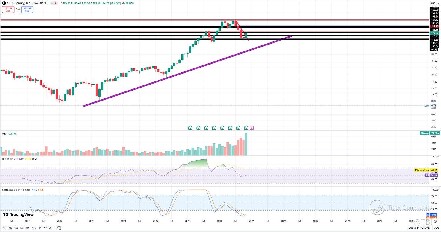 ELF’s monthly chart is a sight to behold - it has been forming higher highs and higher lows since forming a bottom in 2019. Despite the short report by Muddy Waters Research alleging overstated revenues and other fraudulent transactions, the monthly Stochastic saw a bullish crossover after Nov’s close - the first since Dec’23. Nov also saw the largest volume in the stock’s history.