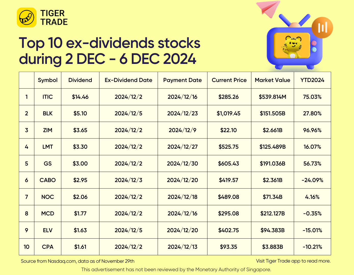 🎁Capturing Top 10 Ex_dividend: ITIC, BLK, ZIM, GS, MCD...