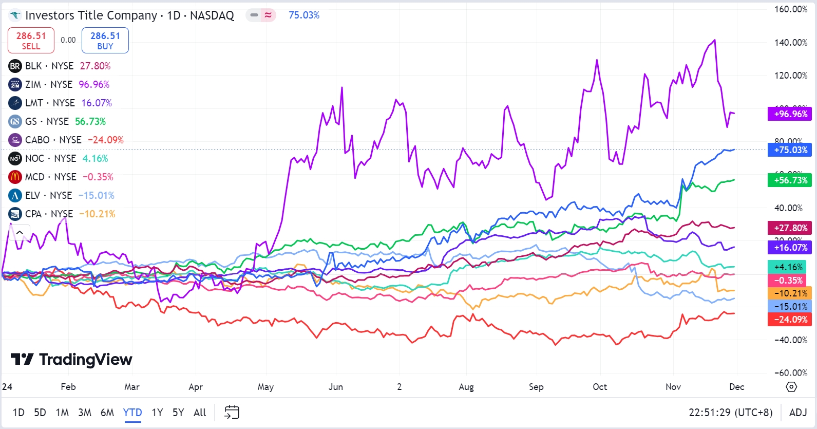 TradingView data reveals that 2024 has been a strong year for several companies as of this publication. Among the top performers are Investors $Investors Title(ITIC)$ $BlackRock(BLK)$ $ZIM Integrated Shipping Services Ltd.(ZIM)$ $Lockheed Martin(LMT)$ $Goldman Sachs(GS)$ $Northrop Grumman(NOC)$. On the other hand, companies like $Cable One(CABO)$ $McDonald's(MCD)$ $Elevance Health(ELV)$ $Copa Holdings SA(CPA)$ have faced declines.