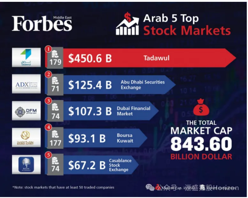 Top 5 stock exchanges in the middle east-Arab countries by market capitalization: Riyadh, Abu Dhabi, Dubai, Kuwait, Casablanca, Data Source: Forbes