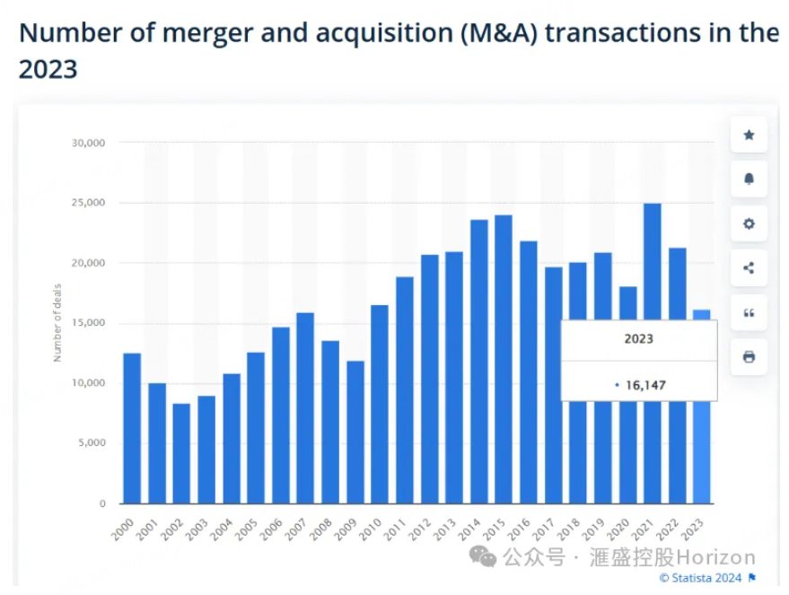 Annual total number of mergers and acquisitions by US companies, 2000-2023