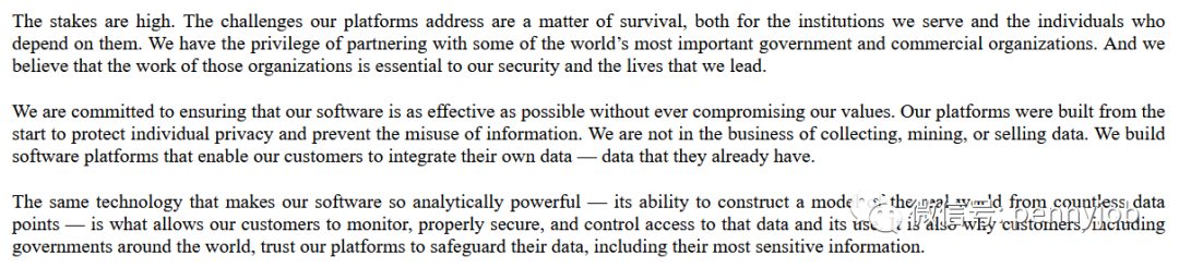 可以說,PLTR不僅僅是爲了在上市之前澄清它們的價值觀,換個思路,PLTR同時也是在爲自己的產品和技術正名,試圖讓大衆理解其產品的時代價值。