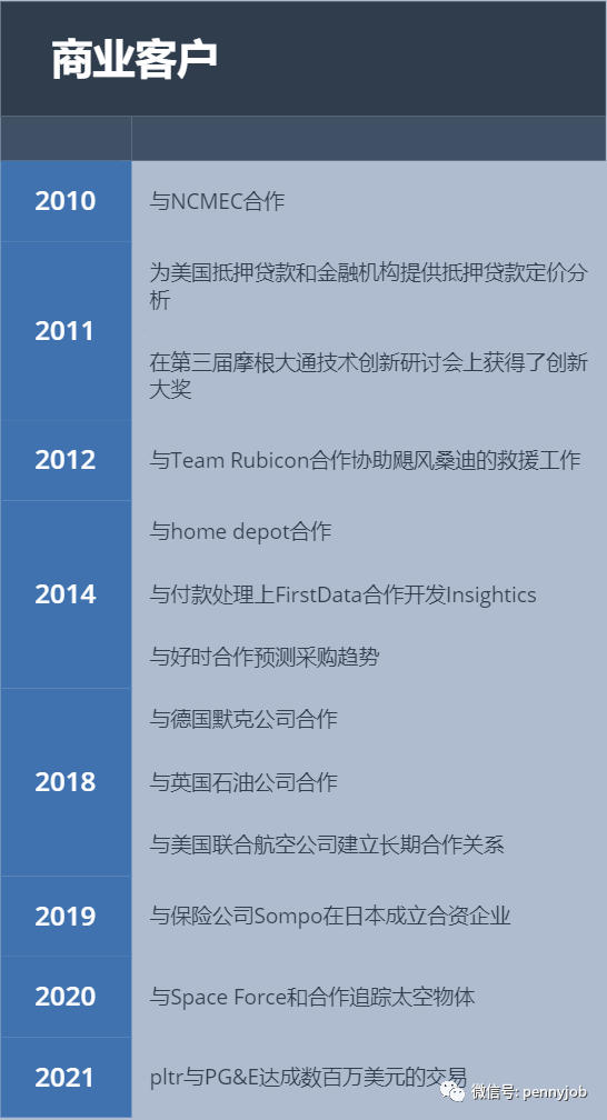 自創立以來,PLTR的主要市場發展道路可見下圖。PLTR自與政府合作嶄露頭角後,開始呈現橫向商業化拓張的趨勢: