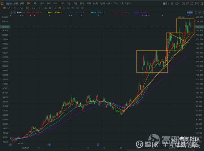回到當下的價格中來,我們需要關注的是187-208這20塊錢的空間將怎麼打破。是在這個價格之下回到162-187的箱體呢,還是繼續突破208向新的空間走去,去250的新區域。