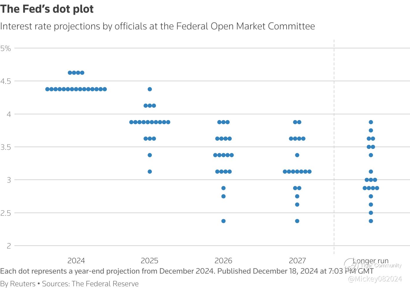 The Federal Reserve recently lowered rates slightly but indicated that future rate cuts may not occur as previously expected. The updated "dot plot" now shows a slower pace of rate reductions. For example, projections for 2026, which once anticipated rates below 3%, now place them at 3.5%. Similarly, rates for 2025, expected to reach 3%, are now projected to stay at 4%.