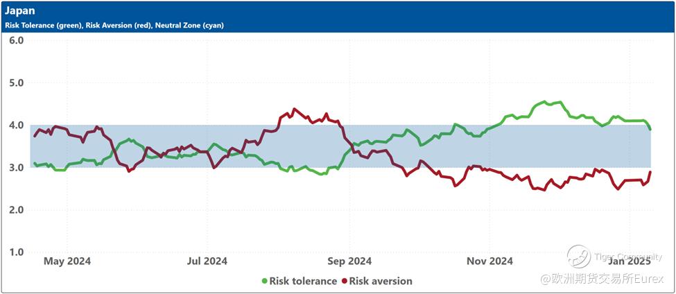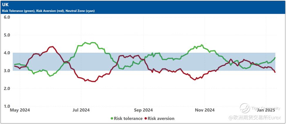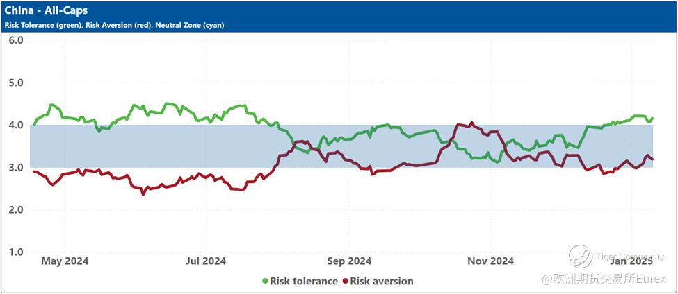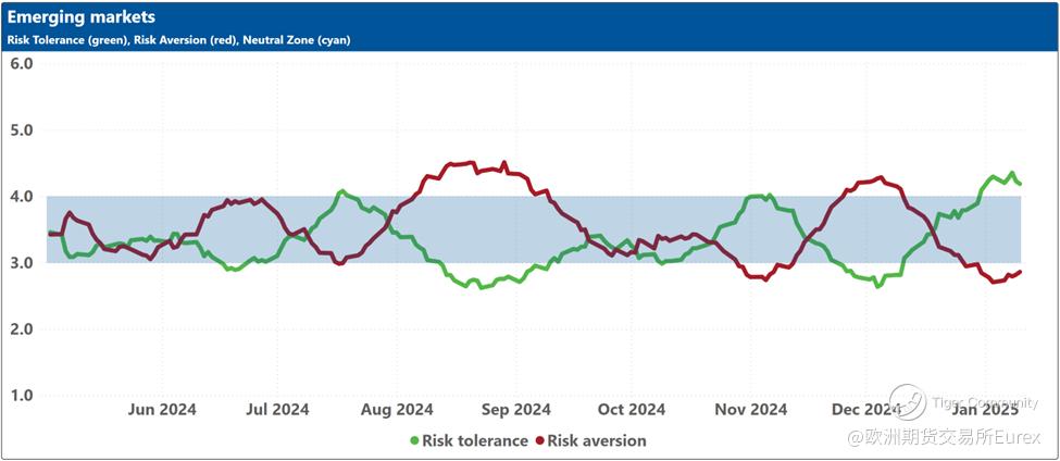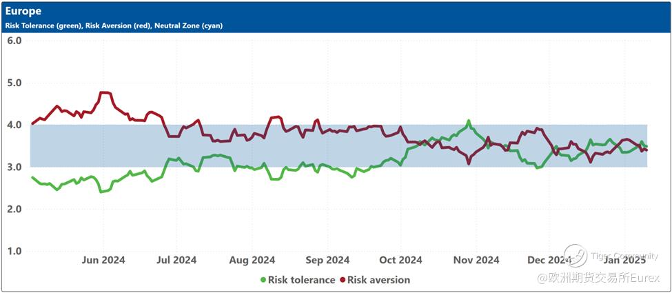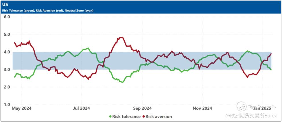 The bottom charts display the levels of risk tolerance (green line) and risk aversion (red line) within the market, representing investors' demand and supply for risk, respectively. Key insights include:
