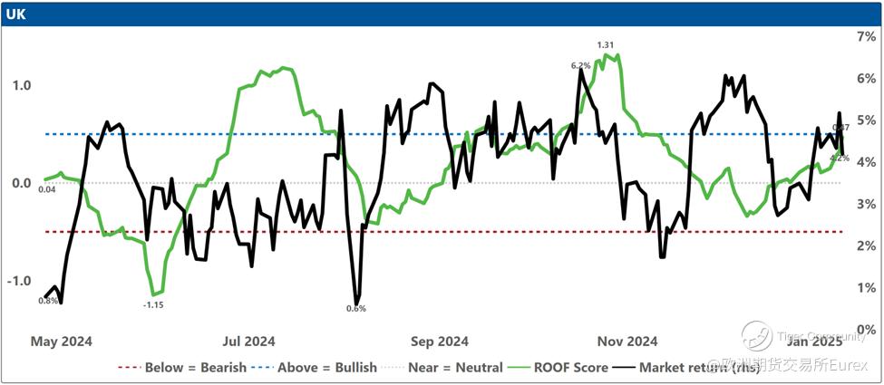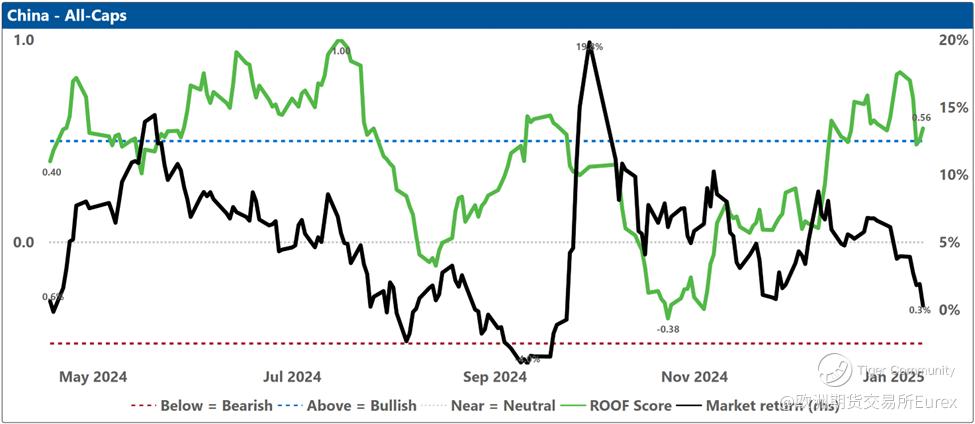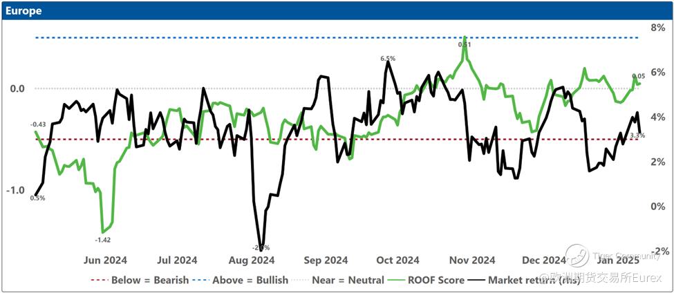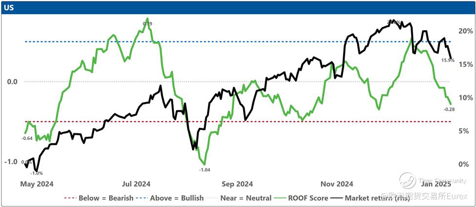 The top charts illustrate the ROOF ratio, which represents investor sentiment. This ratio is depicted in green on the left axis, while the cumulative returns of the underlying market are shown in black on the right axis. Key reference lines include: