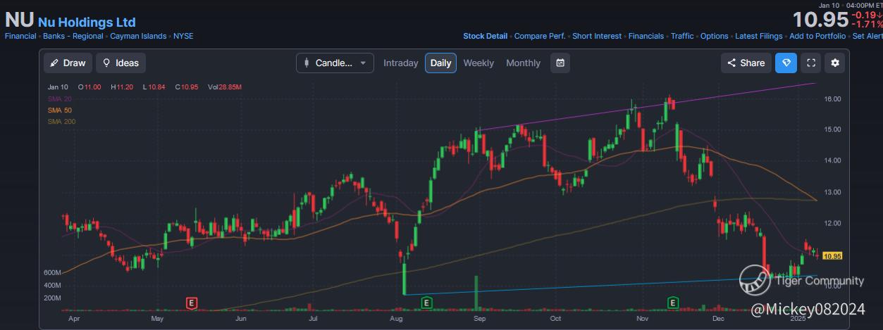 The first stock I want to discuss is Nu Holdings, which is hugely popular on YouTube, is the parent company of Nubank, is a leading digital banking platform operating primarily in Brazil, Mexico, and Colombia. Founded in 2013, Nubank has rapidly expanded its customer base by offering accessible and user-friendly financial services, particularly targeting the underbanked population in Latin America.. The stock is down 30% from its all-time high and is currently trading around $10.95, the same level it was at in early 2024. Nu Holdings is essentially a digital or online bank, similar to SoFi but much larger, with over 110 million members. Most of its operations are in Brazil, but it has expanded into Mexico and Colombia since late 2020.