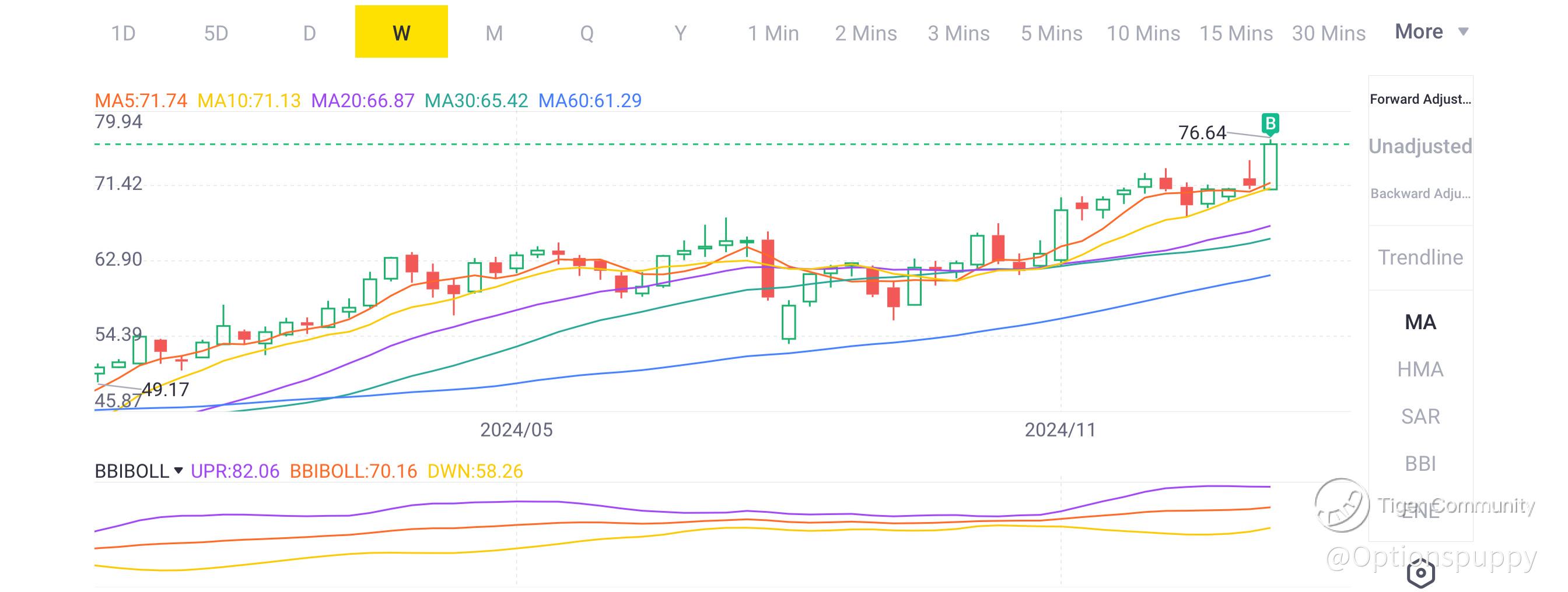 • MA30 & MA60: $65.42 and $61.29, showing a strong medium- to long-term trend.
