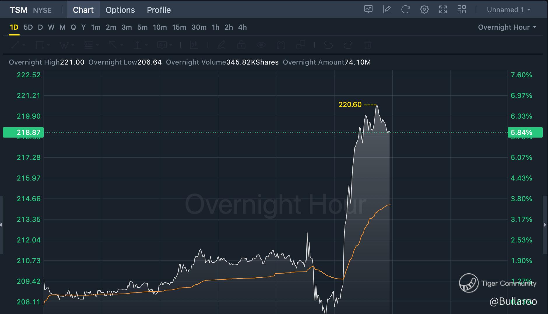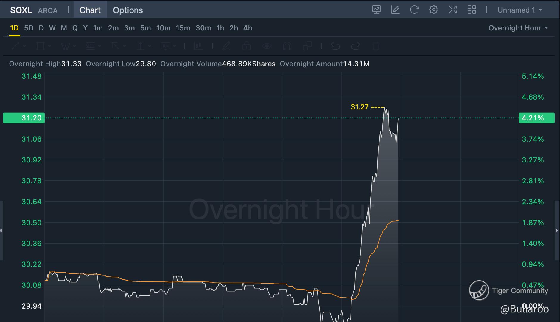 Market Reaction: Following the earnings announcement, TSMC's stock rose over 6% in the overnight session, reflecting investor confidence in the company's direction and the broader tech sector's health. The Direxion Daily Semiconductor Bull 3X Shares (SOXL), an ETF that tracks semiconductor companies, also saw a significant increase of over 4.6%, highlighting the positive ripple effect of TSMC's performance on the industry.