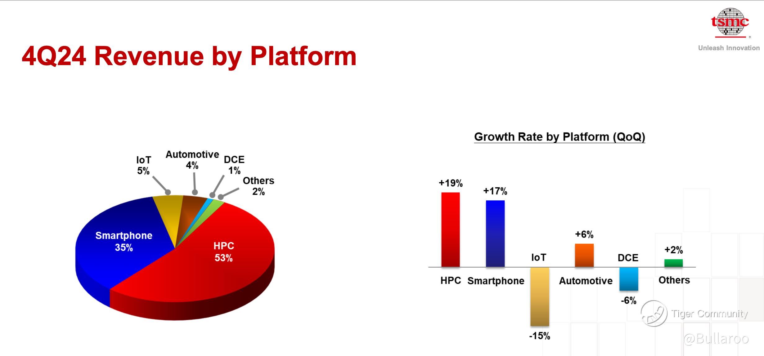 High-Performance Computing (HPC): HPC revenue was the highest among TSMC's platform segments, accounting for 53% of Q4's revenue. This sector grew by 19% from the previous quarter, signalling a strong market for high-performance chips, likely fueled by cloud computing, data centres, and scientific research.
