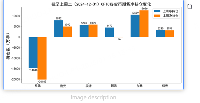 According to the U.S. Commodity Futures Commission's report on December 31, 2024, last week, the net short position of the euro changed by 5,477 lots, the Australian dollar's by 2,952 lots, and the British pound's net long position changed by 170 lots. The net short position of the Japanese yen changed by 4,546 lots, the Canadian dollar's net long position changed by 2,037 lots, and the New Zealand dollar's net short position changed by 33 lots. The euro was the currency with over a 20% change in total one - way positions.