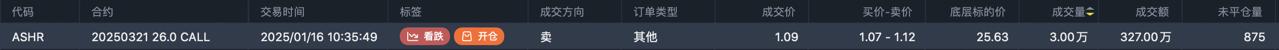 $ASHR 20250321 26.0 CALL$ 26 call expiring in March, opened 32,000 lots, with a total transaction value of approximately 3.48 million.