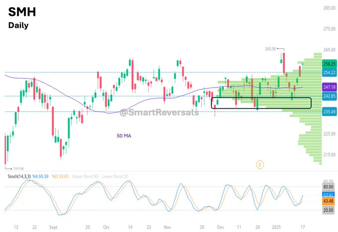 $VanEck Semiconductor ETF(SMH)$ - Price bounced from the highlighted demand zone, coinciding with the lower edge of the volume shelf.