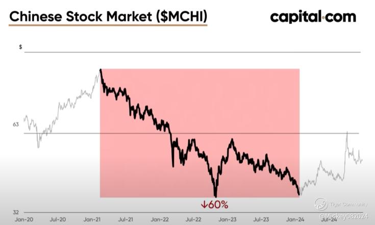 So, what could spark a turnaround in China? The country’s economy has been facing multiple headwinds, including sluggish growth, a troubled real estate sector, and weak consumer demand. Consumer confidence in China is at its lowest since the 1990s. When confidence is low, people tend to save more and spend less, which can further suppress economic growth. These challenges have contributed to a more than 60% decline in China’s stock market between 2021 and early 2024.