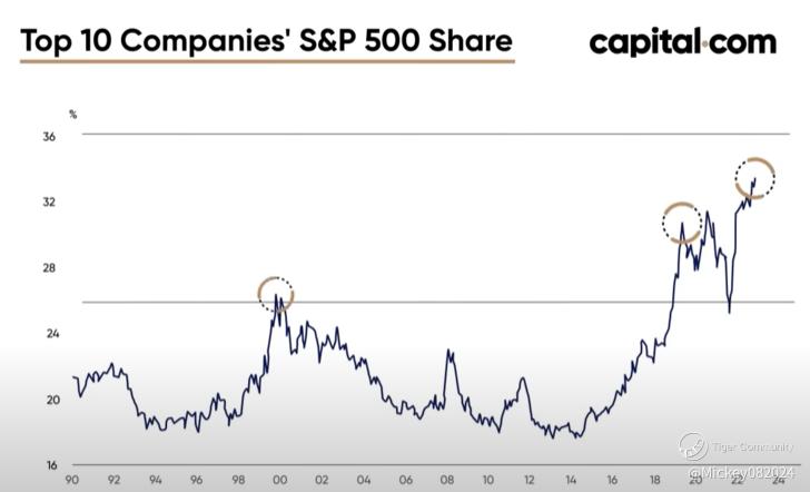 Market concentration is currently at one of the highest levels in the last three decades, surpassing even the peak of the dot-com bubble in 2000. Back then, a small group of companies like Cisco, GE, Intel, and IBM dominated the index, leaving it vulnerable when the bubble burst.