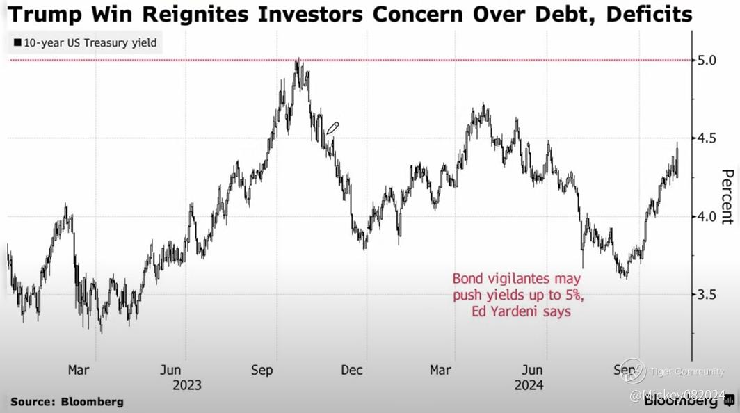 Several structural factors further complicate the picture, such as globalization, aging populations, political instability, climate change spending, and the rising cost of servicing debt. Investor concerns about deficits have intensified, especially under political pressures like those brought by Trump. Analysts, like Ed Yardeni, suggest that yields could hit 5%, but the implications remain uncertain. Yardeni also recently predicted the S&P 500 could rise to 5,000 in this environment, though his previous claim of 7,000 has already been walked back.