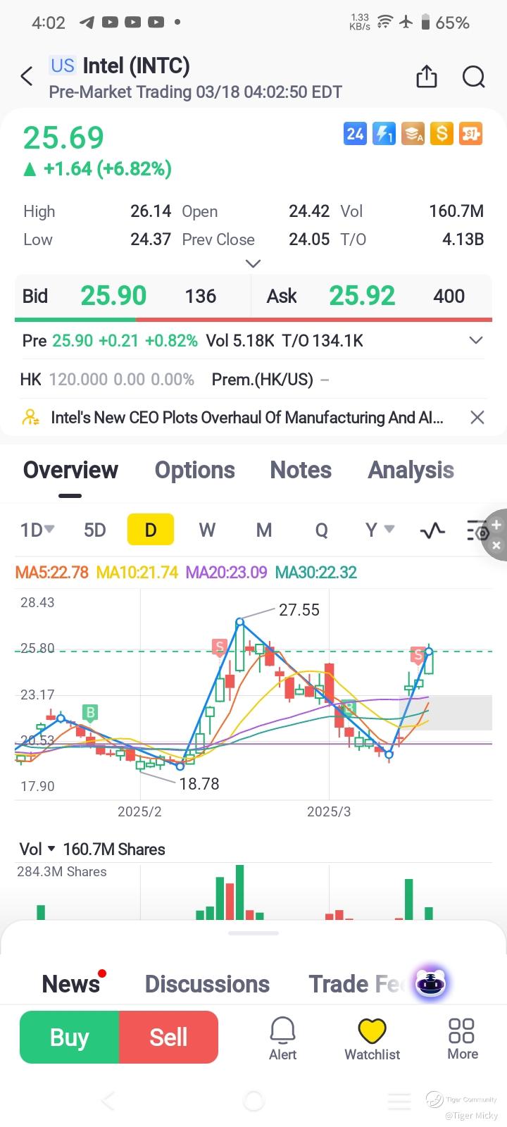 Intel has climb significantly especially from last week after a steep dive since Trump stupid trade war especially with China. I had lock in partial gain last week @ 24. Currently has breached 26 & trying to establish momentum. If it can sustain around 28, there is a good chance to target 29-30. Hopefully!