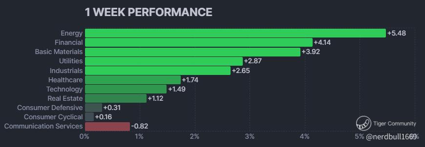 On the weekly performance, the performance is relatively good, with energy, financial and basic materials leading the sectors. Communication services which was down by 0.82% was dragged by names like $Alphabet(GOOGL)$ and Meta. But overall we are still seeing them holding onto their gains respectively on Wednesday (19 March).