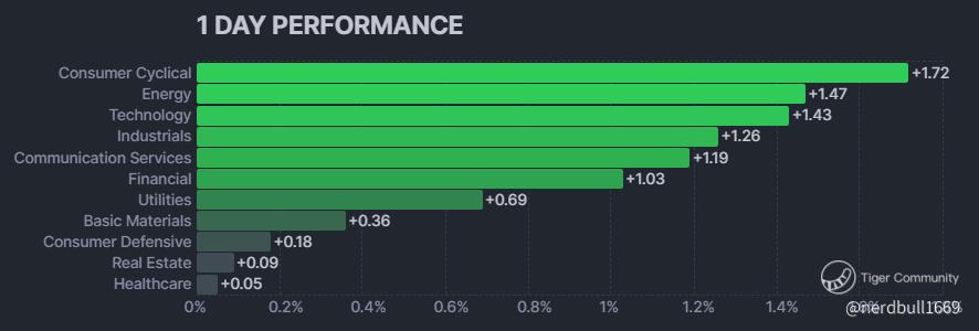 Looking at the sector on 1-day performance, we can see that all 11 S&P 500 sector was up in the green, with consumer cyclical, energy and technology closed above 1.4%