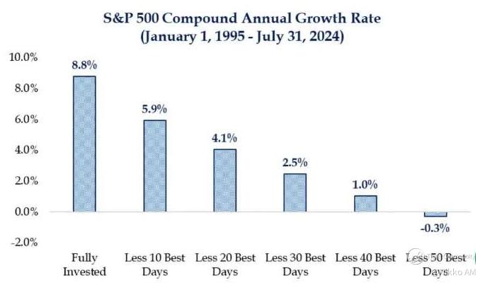 Take the S&P 500 as a reference. If you had stayed fully invested in the index from 1 January 2005, to 31 July 2024, your annualised returns would be 8.8% per year. However, if you just missed 10 of the best days during this period, you returns would be significantly lower at just 5.9% per year. And if you missed the 40 best days, your returns would drop to a mere 1.0% per year.