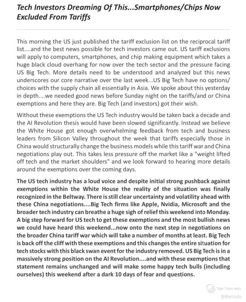As I wrap this up, Iβm struck by the duality of this moment. The tariff exemptions are a lifeline for the Mag 7 and tech at large, likely sparking a Monday bounce. But the spectre of future tariffs, shifting policies, and geopolitical chess keeps me grounded. Investors should savour the relief but stay sharp, volatility isnβt going anywhere.