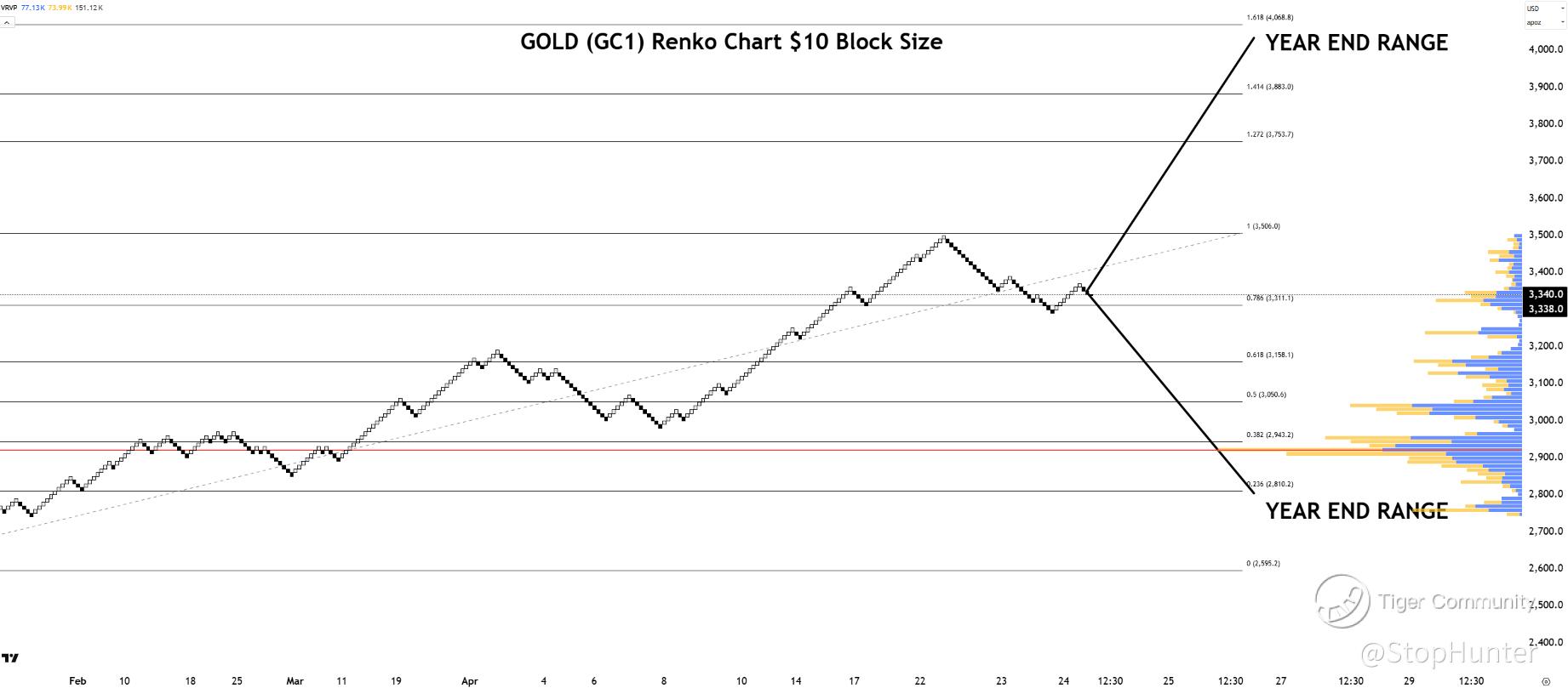 1️⃣ Renko Technical Analysis – Filters out noise, highlights trend strength – Our breakout zone began at $3,400 – Fibonacci extensions project clean targets: $3,650, $3,800, and $4,000