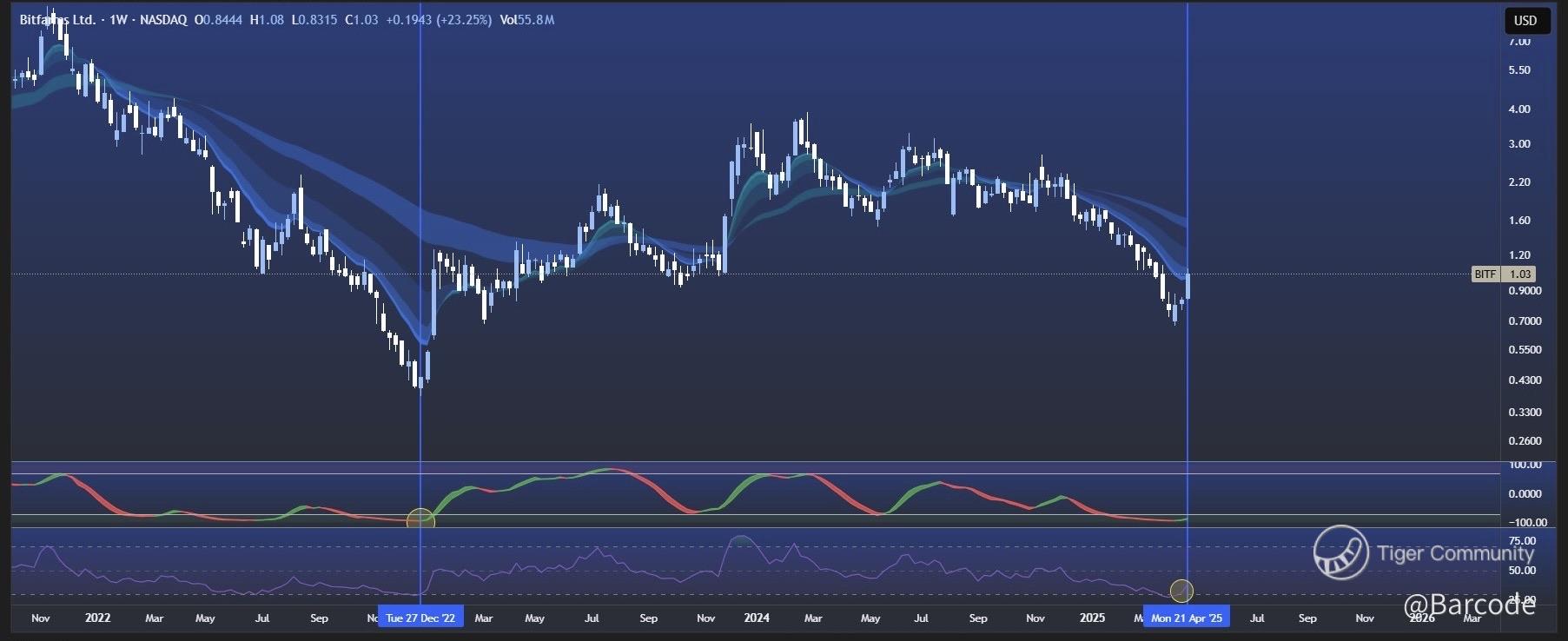 $BITF bulls have waited through relentless volatility, but the signals have finally aligned. RSI is curling upward from oversold levels, and TMO (True Momentum Oscillator) has flipped bullish on the weekly chart. The last time these indicators synchronised at this scale was in late 2022, which unleashed a powerful rally!