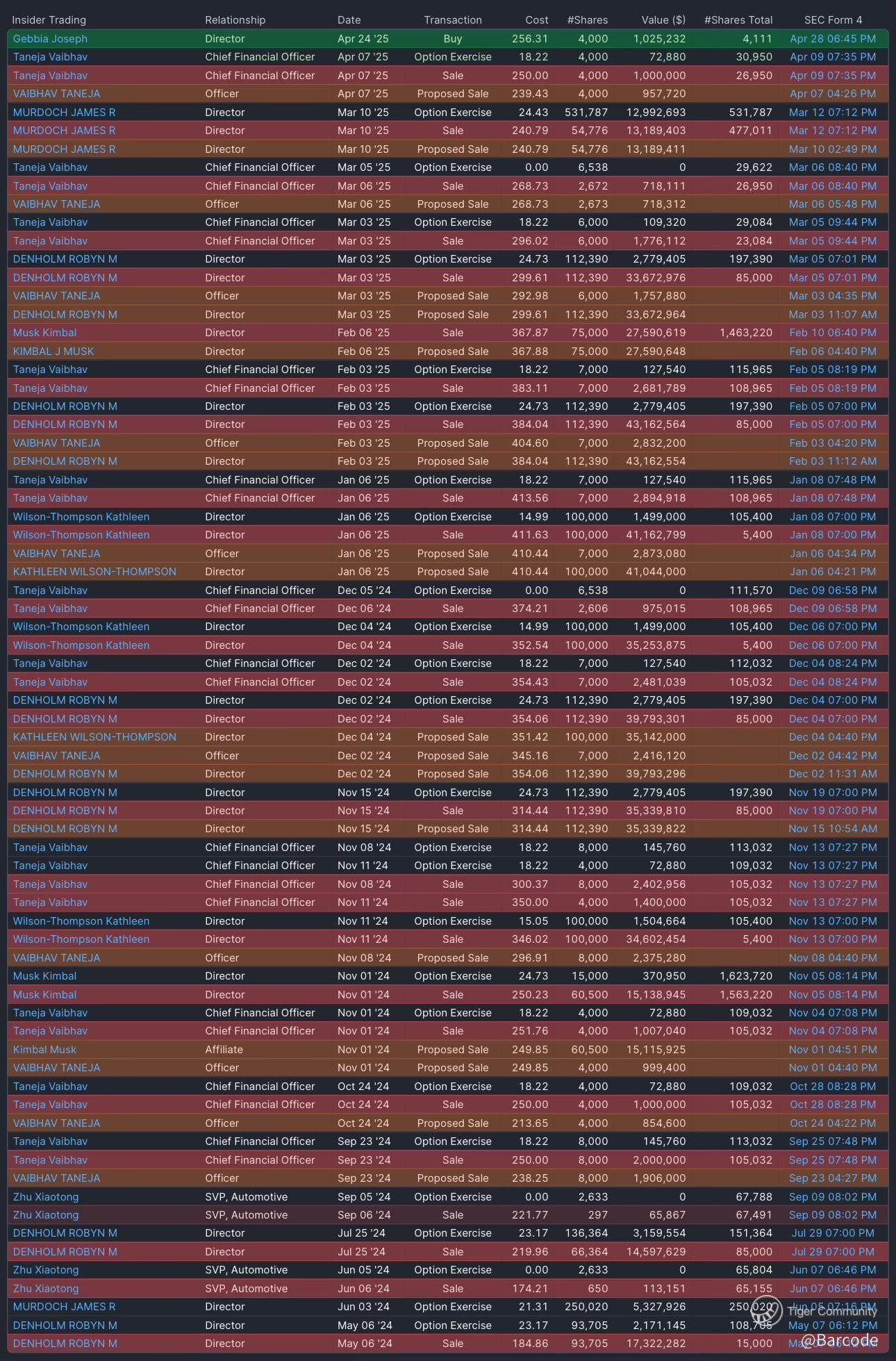 Teslaβs insider tape from mid-2024 to today reads like a well-rehearsed script: structured option exercises followed by predictable sales. Robyn Denholm, Vaibhav Taneja, and James Murdoch have each executed large-scale liquidations, such as Denholmβs March 3, 2025, sale of 112,390 shares at $247.31 and Tanejaβs April 7, 2025, sale of 4,000 shares at $258.22.