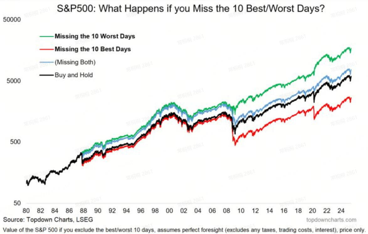 有趣的是,兩者都缺失10個最好的日子和10個最差的日子排名第二——這表明大幅上漲並不能完全抵消最大跌幅的痛苦。