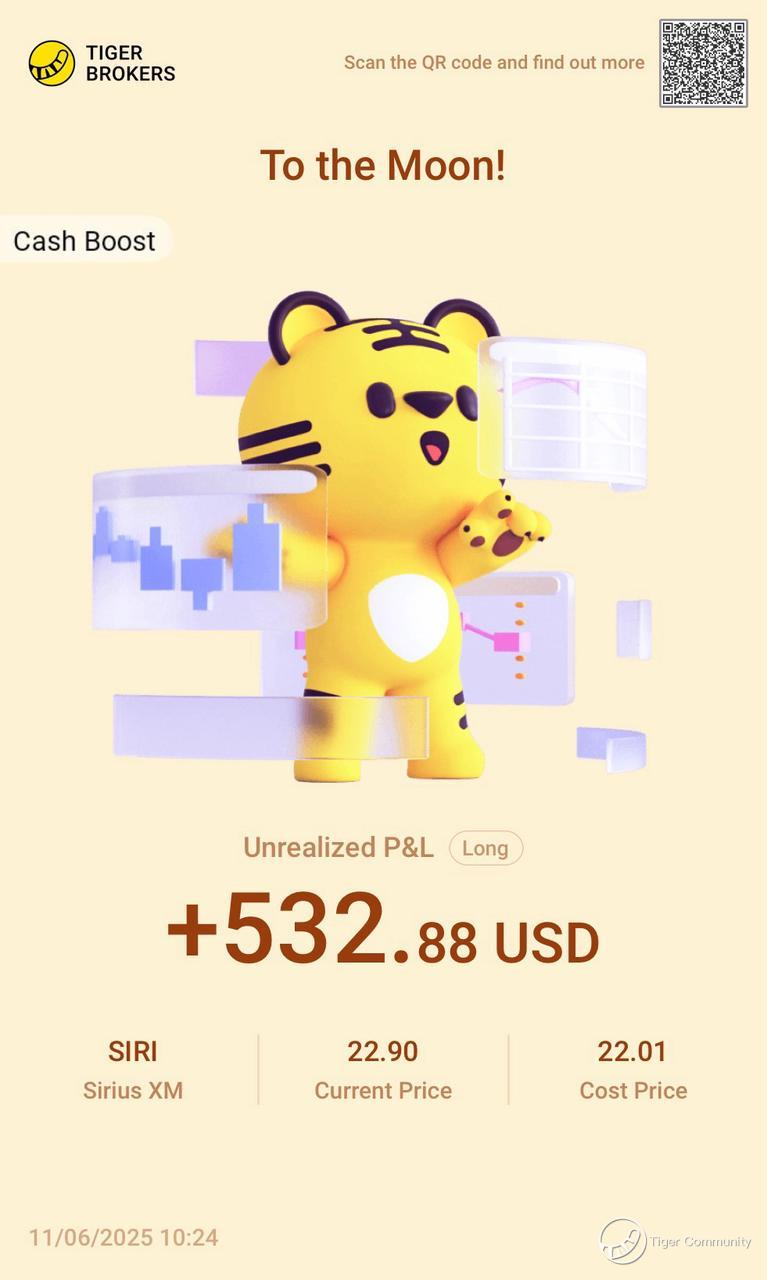 $Sirius XM(SIRI)$ jumped 3.7% today, the third green day in a row! Market’s looking solid overall, and it’s outperforming its peers. Told ya, my instincts were right. Holding steady is the real skill, haha!