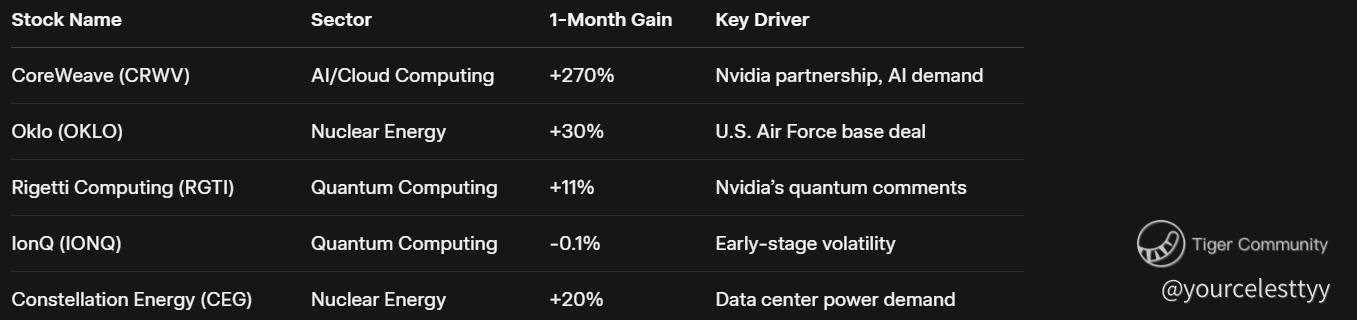 Here’s how key players in these sectors have performed recently: $CoreWeave, Inc.(CRWV)$ $Oklo Inc.(OKLO)$ $Rigetti Computing(RGTI)$ $Qinqin Foodstuffs Group Cayman Co Ltd(QQFSF)$ $Constellation Energy Corp(CEG)$