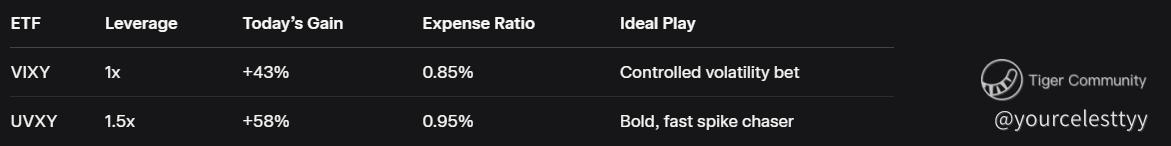 VIXY (ProShares VIX Short-Term Futures ETF) No leverage, tracks short-term VIX futures. Up 43% today, a solid bet for steady volatility gains. Expense ratio: 0.85%.