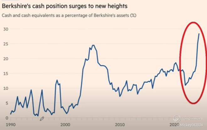 Berkshire Hathaway now holds more than $189 billion in cash and cash equivalents, according to its latest filing—an all-time high. But it’s not the absolute number that tells the story. It’s the cash-to-assets ratio that really speaks to Buffett’s outlook.