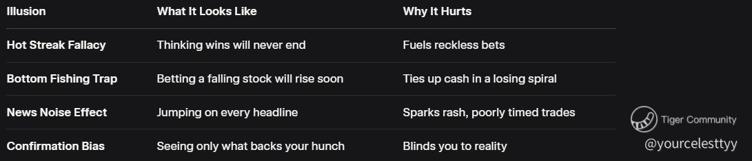 These illusions aren’t just mistakes—they’re psychological quirks that twist how we see the market. Here’s a rundown of the big ones: