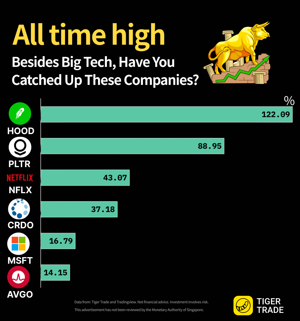 HOOD(Robinhood)是让我最意外的一只。原以为加息周期下,散户交易会冷却,结果它反而因为加密货币业务和财报改善起飞,我当时完全没在车上。至于NFLX,早在密码共享打击开始那一波就重仓过,复苏逻辑实锤,现在继续持有。CRDO和MSFT我也有配置,尤其是微软,基本是AI“定海神针”级别的存在,不持有反而才奇怪。