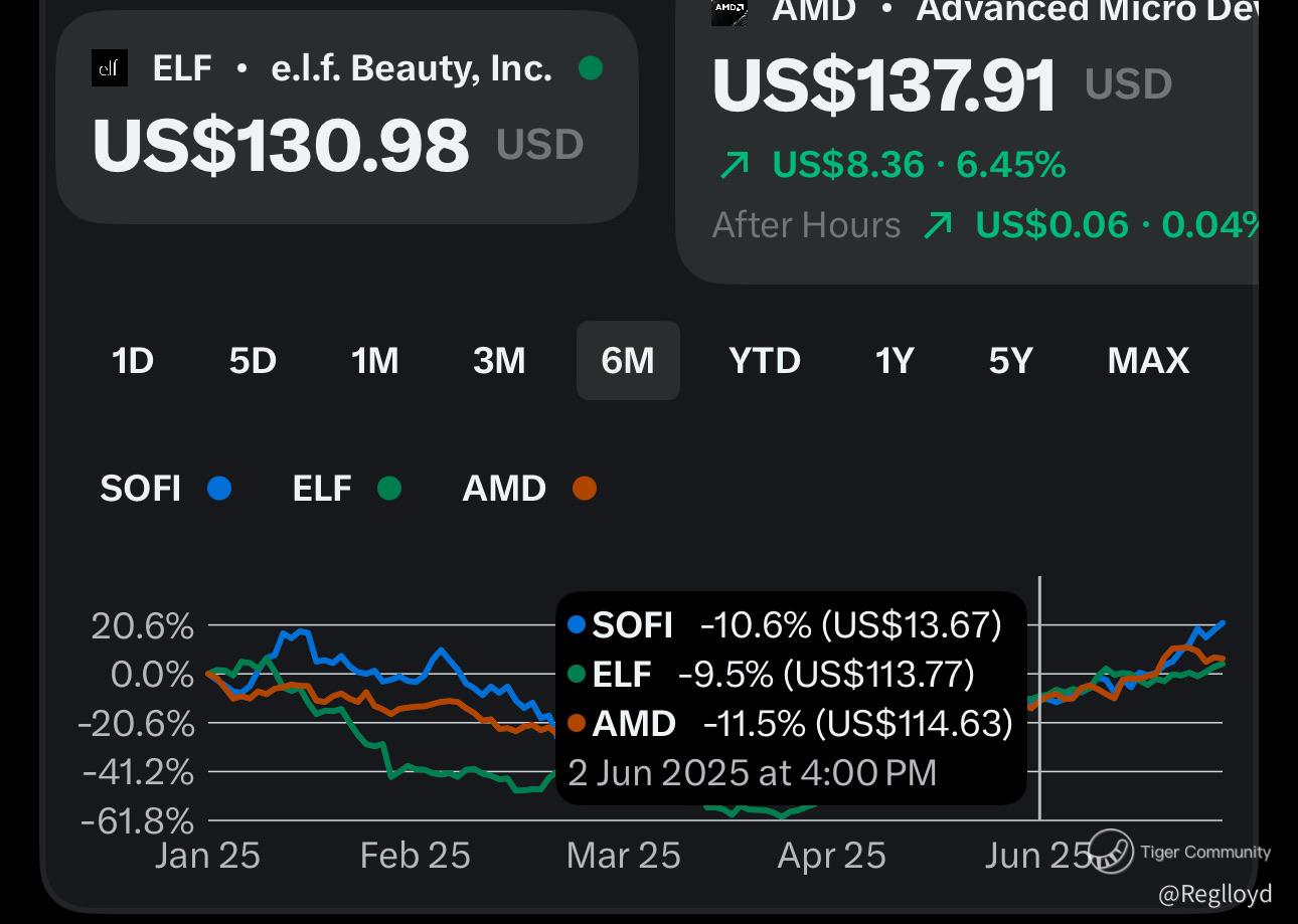 Below is a detailed compilation of my Top 3 most-watched stocks. I have asked Grok at helping me compile this summary by providing Grok with the key variables required in this analysis such as a brilliant CEO Anthony Noto for SOFi , not to mention being the next Banking Giant of tomorrow and then Elf Beauty and how they are slowly taking market share by having a presence In just about any outlet including their drive into Europe, and then the key for AMD being that they are not in direct competition to Nvidea, that they have their own unique space in this evolving AI space.