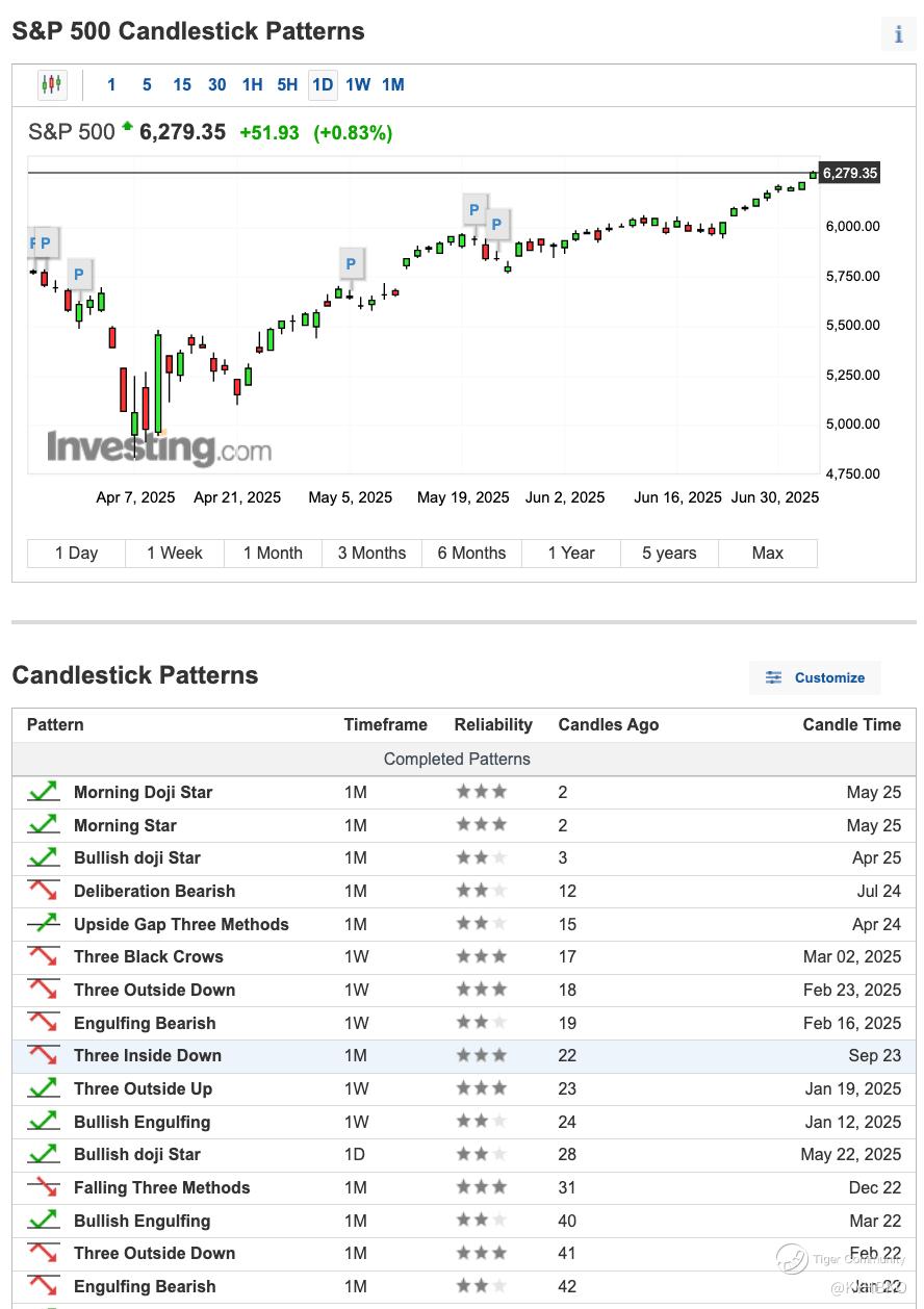The candlestick patterns suggest a bearish short-term outlook with a neutral long-term outlook, indicating the S&P 500 may be entering a correction phase following its recent high, with the potential for a trend reversal depending on support levels and new pattern formations.