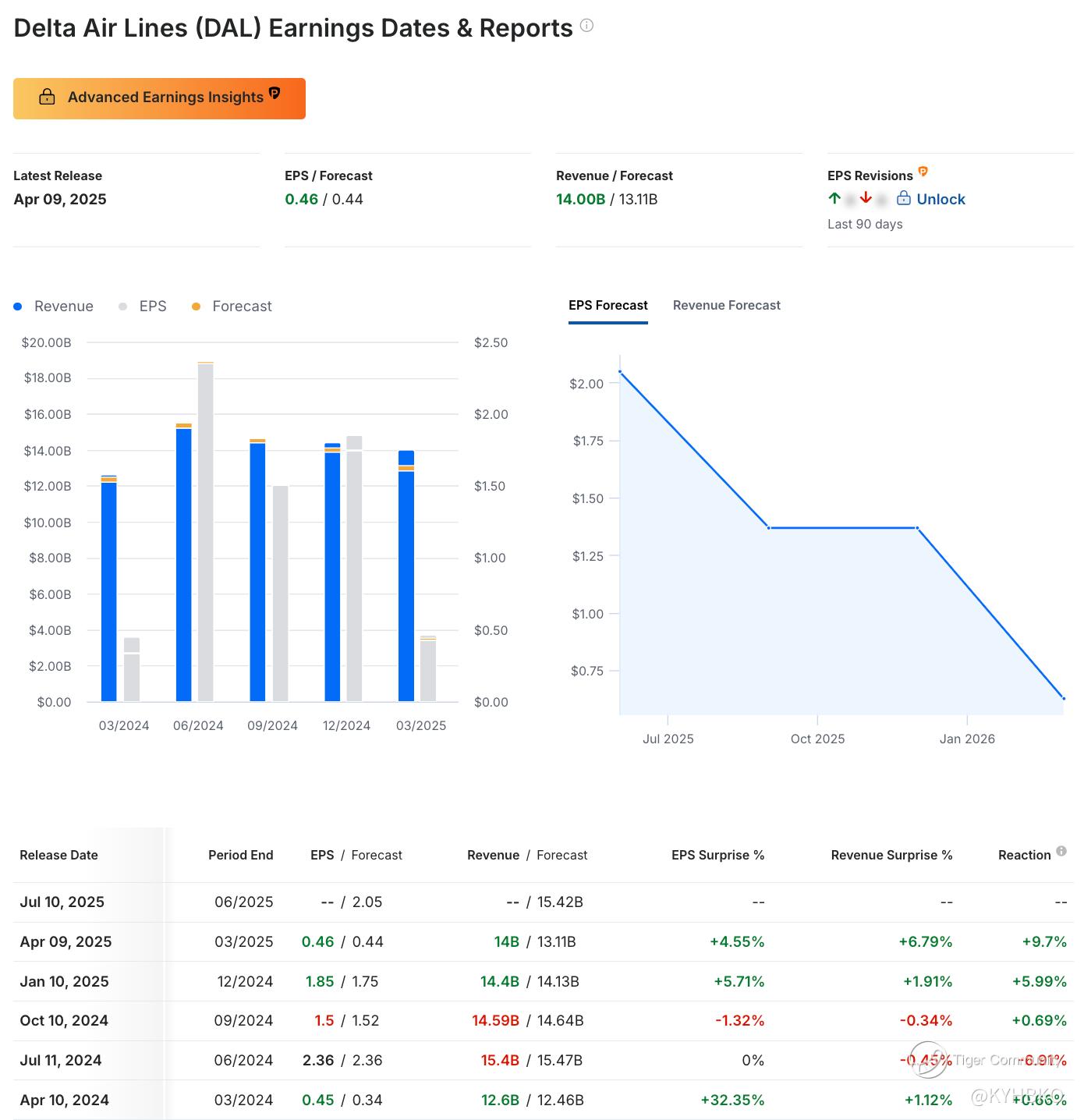 Delta Air Lines coming earnings have a forecast of $2.05 and $15.42B for the EPS and revenue, respectively.