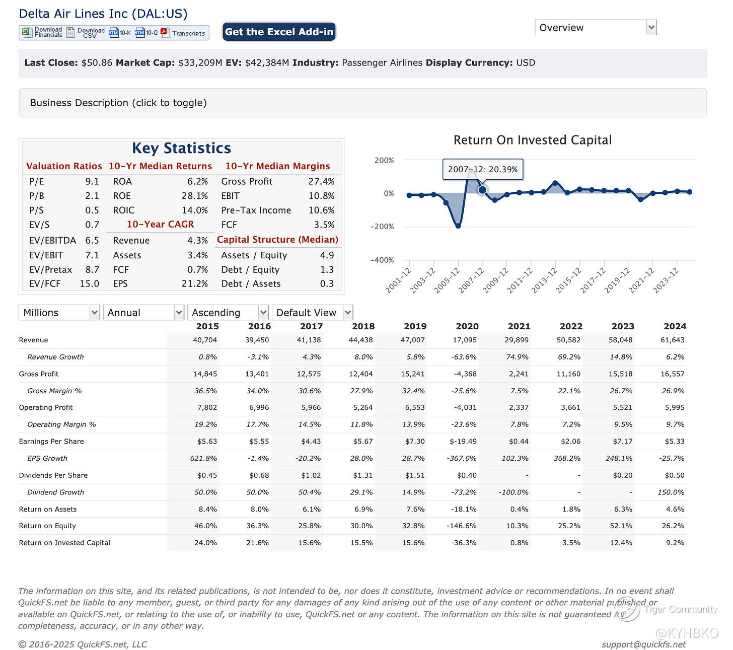 Over the past 10 years, Delta Air Lines has demonstrated resilience and growth, with revenue increasing at a 4.3% CAGR and EPS at a 21.2% CAGR, driven by its leadership in the U.S. airline market. Operating profits rebounded to $6.303 billion in 2024 after a significant loss in 2020, reflecting operational recovery. The company resumed dividends at $0.50 in 2024, and its P/E ratio of 9.1 suggests undervaluation. Modest FCF growth and a manageable debt profile support its financial flexibility. Delta’s competitive advantages include its extensive network, premium service offerings, loyalty program, and operational efficiency, positioning it well in the airline industry. However, its performance remains sensitive to economic cycles and fuel costs, as seen in the 2020 downturn, requiring continued strategic focus as of July 2025.